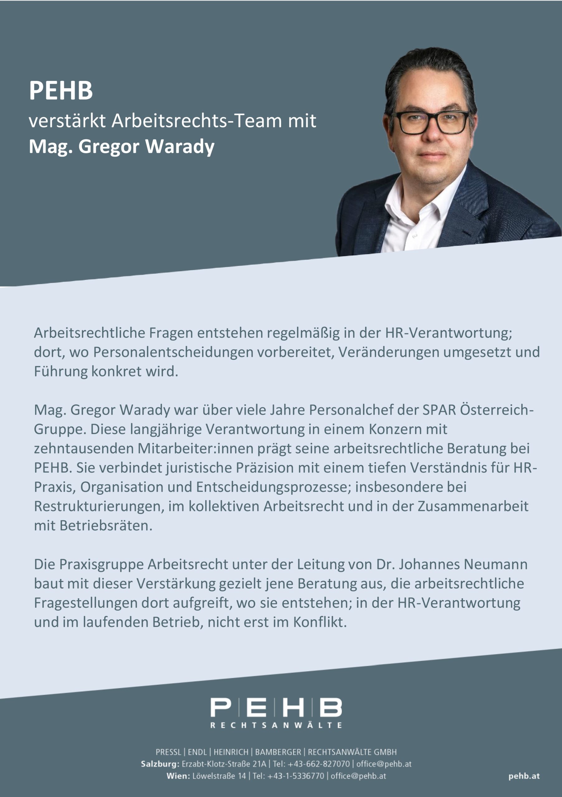 • PEHB verstärkt Arbeitsrechts-Team mit Mag. Gregor Warady